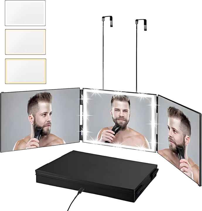 Miroir 3 voies pour la coupe de cheveux, miroir à trois volets réglable en verre véritable avec lumière LED 3 couleurs et crochets télescopiques pour le maquillage