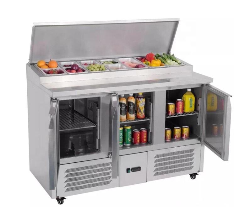 3 doors Saladette Pizza prepairing table refrigerator with steel lidProduct name
