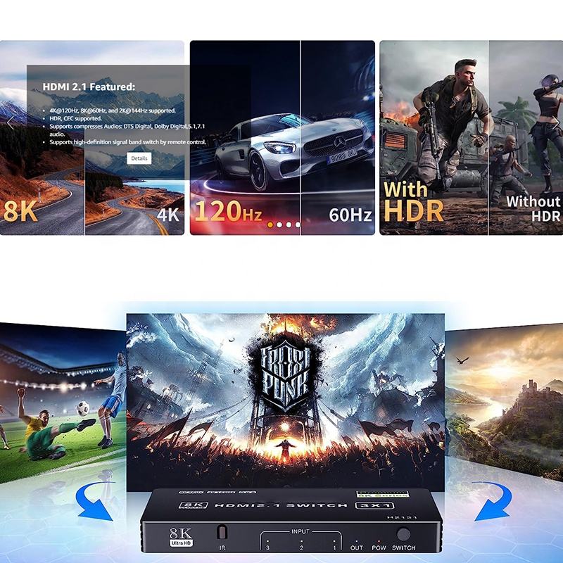Commutateur HDMI 3 en 1 sortie 4K 120Hz 8K 60Hz Commutateur HDMI 3x1 UHD 3 ports avec télécommande IR HDCP 2.2 Support 3D