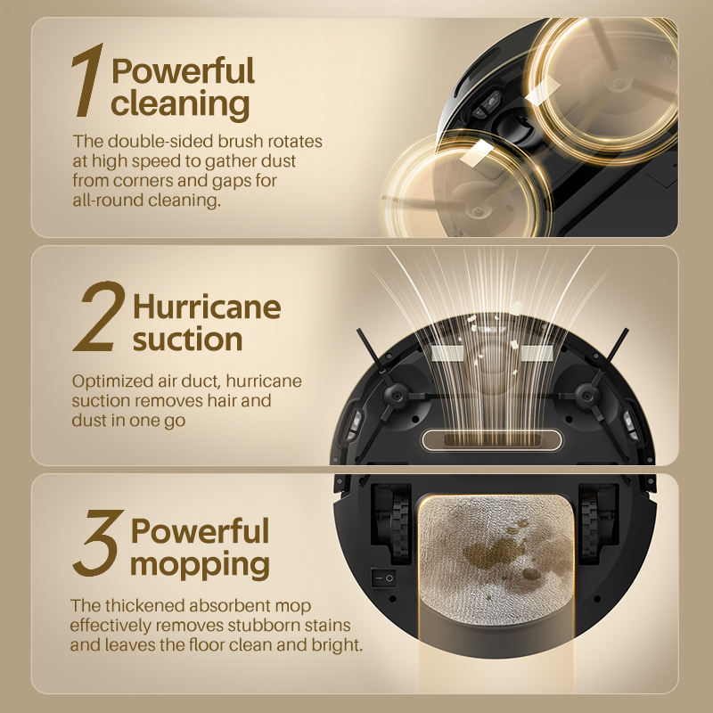 Caractéristique:Nettoyage automatique, Auto-recharge, Écologique, Nettoyage des bords, Navigation chambre par chambre, Programmation