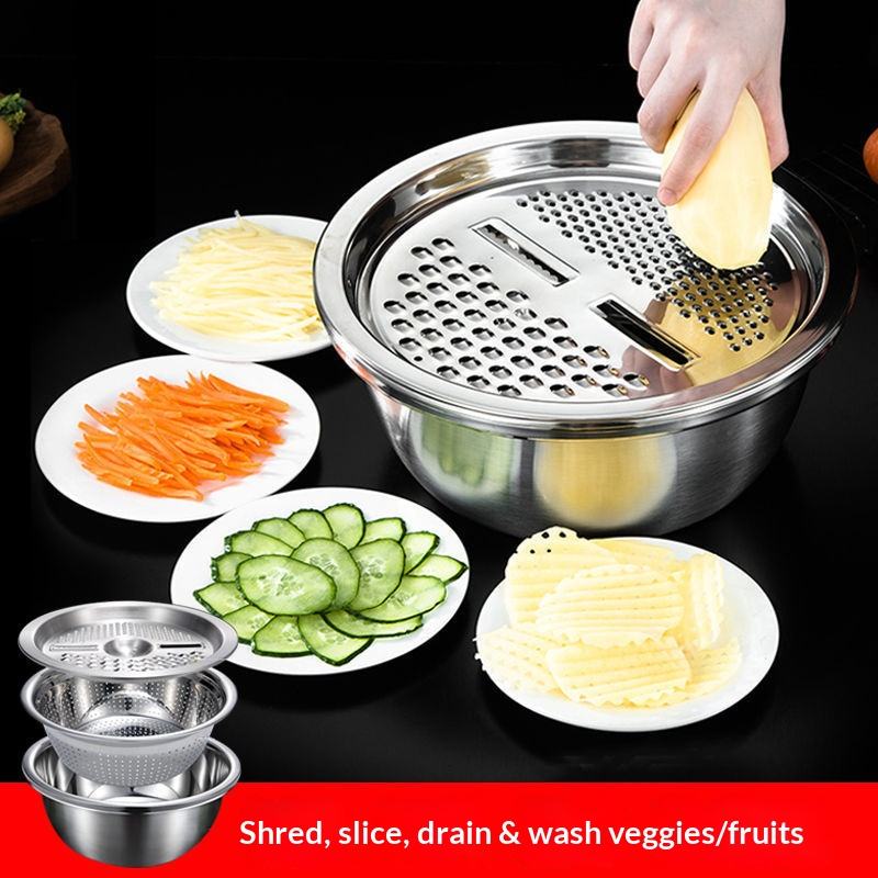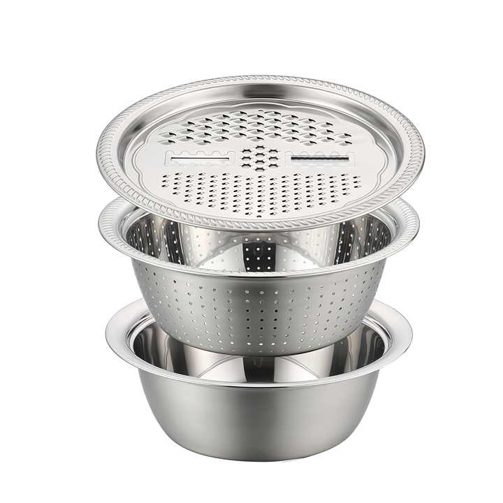Ensemble de cuisine multifonctionnel 3-en-1 en acier inoxydable - Passoire, râpe, trancheuse pour le lavage du riz, la préparation de salades et la découpe des légumes