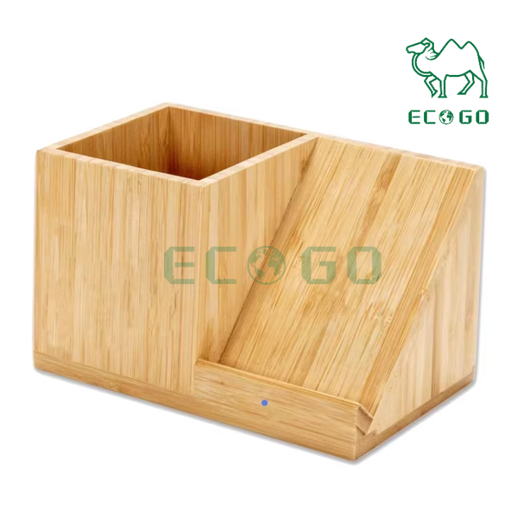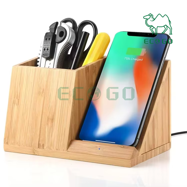 Chargeur sans fil 3 en 1 avec logo personnalisé Support de chargeur sans fil en bambou avec porte-stylo Organisateur