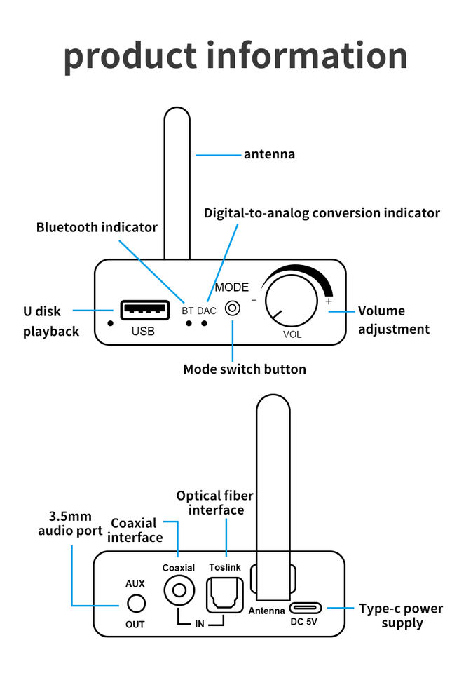 3-en-1 pour récepteur Bluetooth 5.0 convertisseur audio analogique numérique lecture analogique USB adaptateur AUX répartiteur audio
