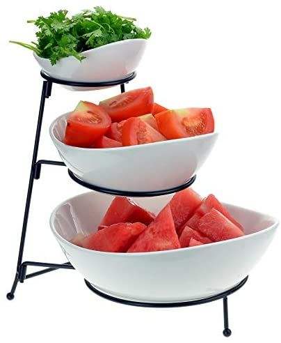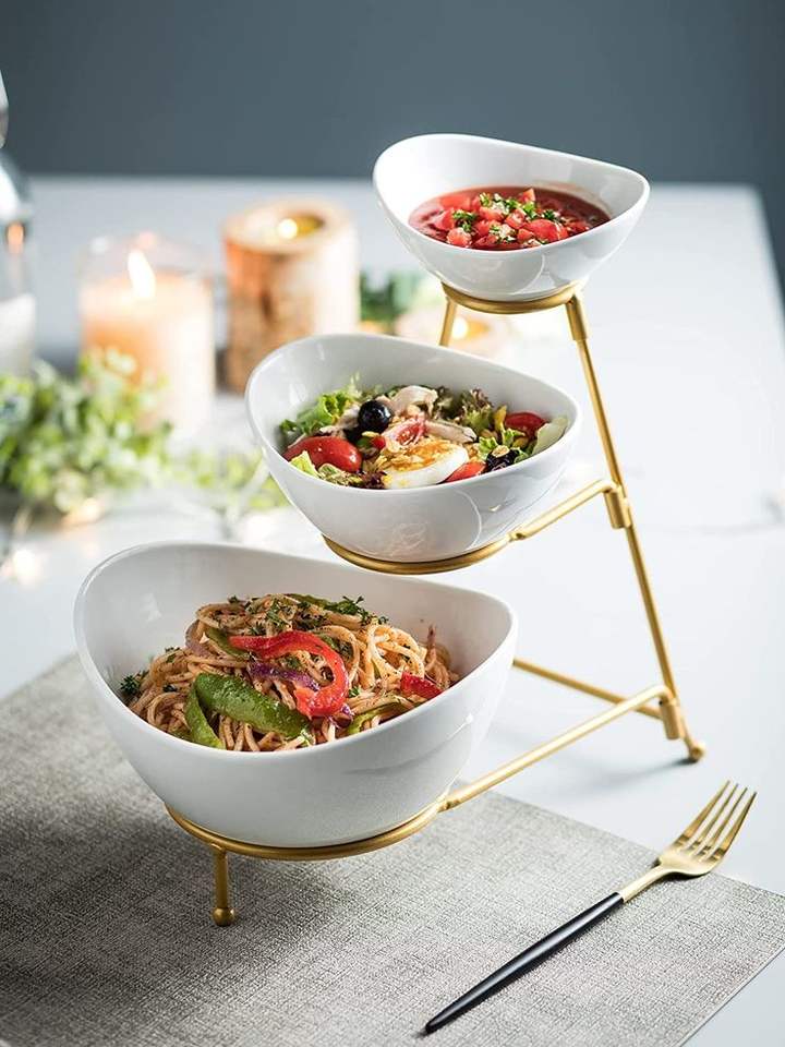 Support de service à 3 niveaux, support de service en bambou, support pour bols en céramique, support pour organiser les en-cas, support à desserts, étagère de service