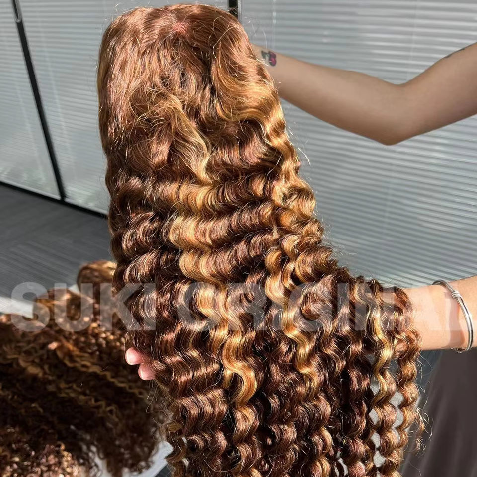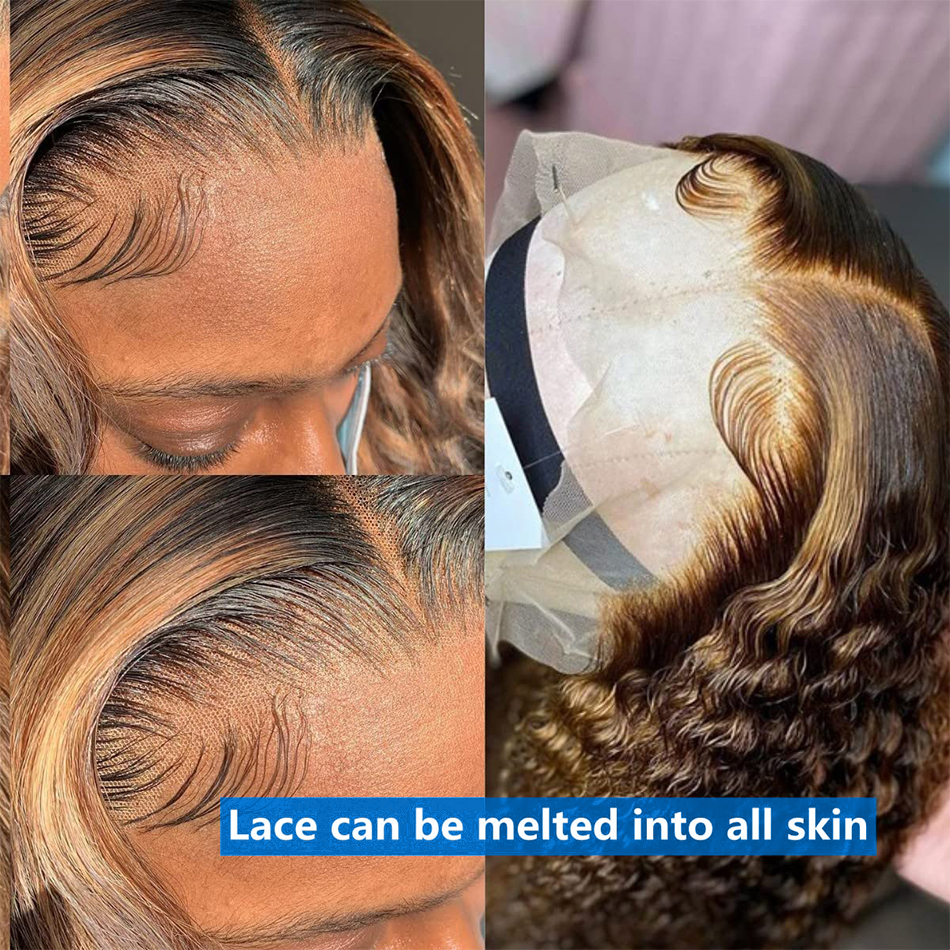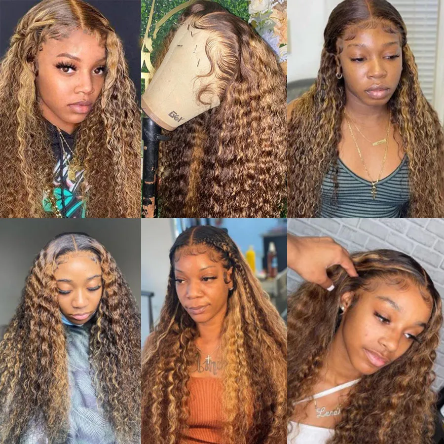 30 pouces 250 densité mettre en évidence miel brun bouclés HD dentelle avant perruques de cheveux humains 13x4 13x6 couleur ombrée eau profonde vague frontale perruques