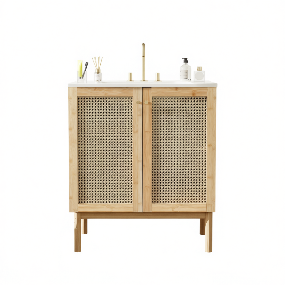 Meuble-lavabo de salle de bain 30 pouces en matériaux naturels, portes en rotin faites à la main, design moderne minimaliste sur pied