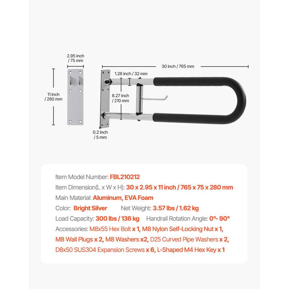 Barre d'appui de sécurité pour toilettes pliable en U de 30 pouces, antidérapante, pour personnes âgées et handicapées