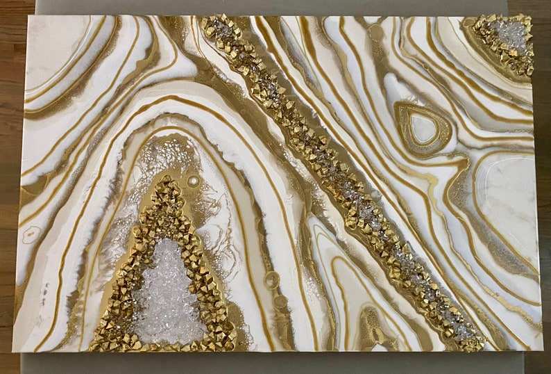 30% de réduction sur commande article 3D blanc et or géode Art mural décoré avec Quartz et Améthyste peinture résine oeuvre