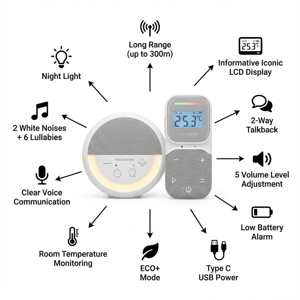 Berceuses, Rappel de l'alimentation, Vision nocturne, PAN-TILT, Audio bidirectionnel, Surveillance de la température, Built-in SirèneUsages spéciaux
