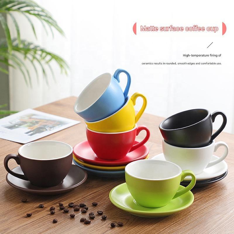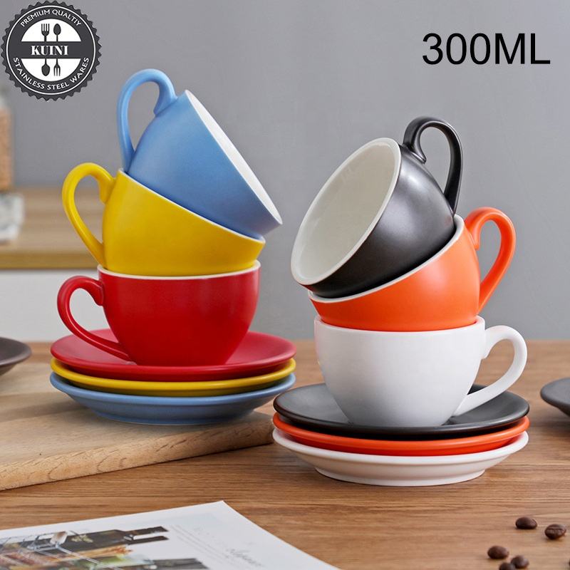 300ml Colorful Ceramic Cappuccino Coffee Cup Saucer Set, Barista Competition Standard Latte Mug Wide Mouth Design, Custom Logo