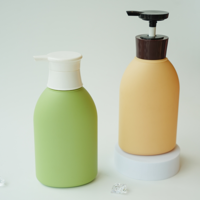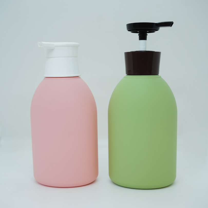 Bouteilles en plastique plates vides en HDPE de 500ml en impression de transfert de chaleur de pompe de lotion verte rose pour shampooing gel douche nettoyant pour le visage
