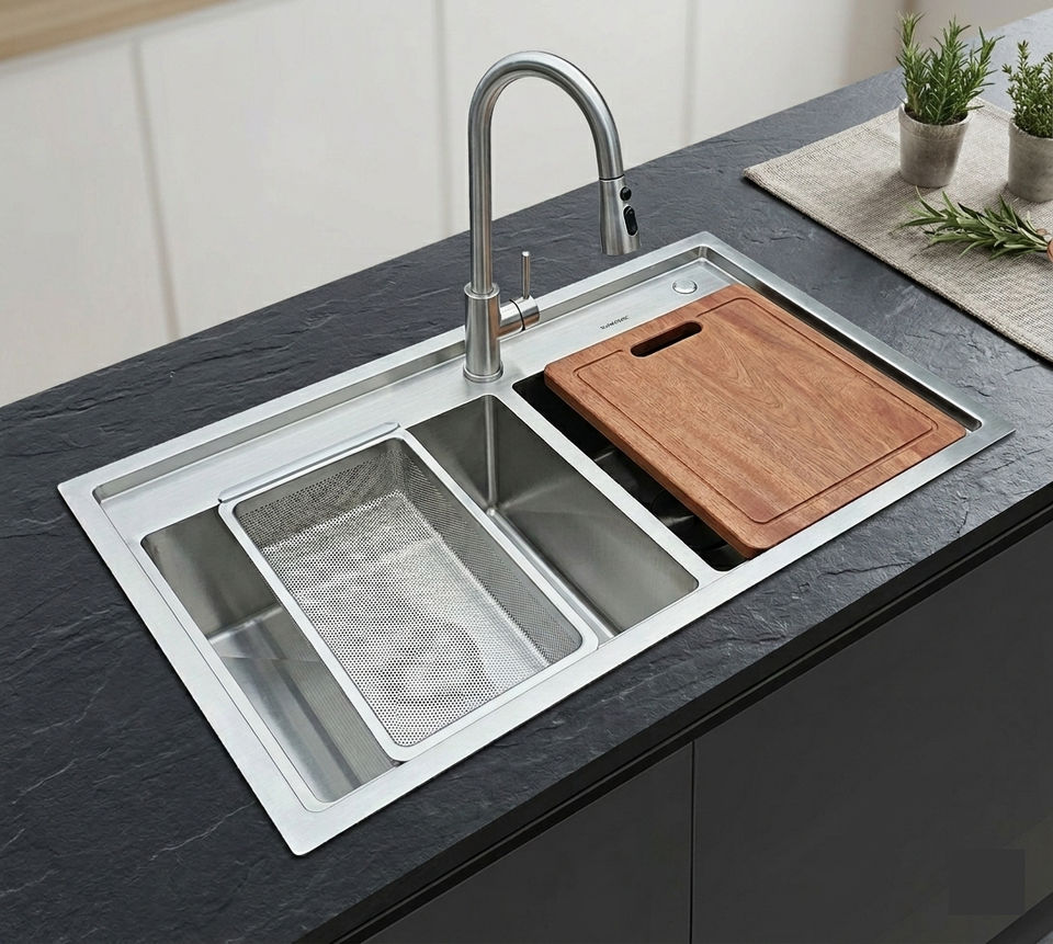 Évier de cuisine en acier inoxydable 304, double bac, fait main, à encastrer, finition brossée, anti-rayures, OEM disponible