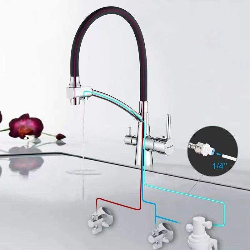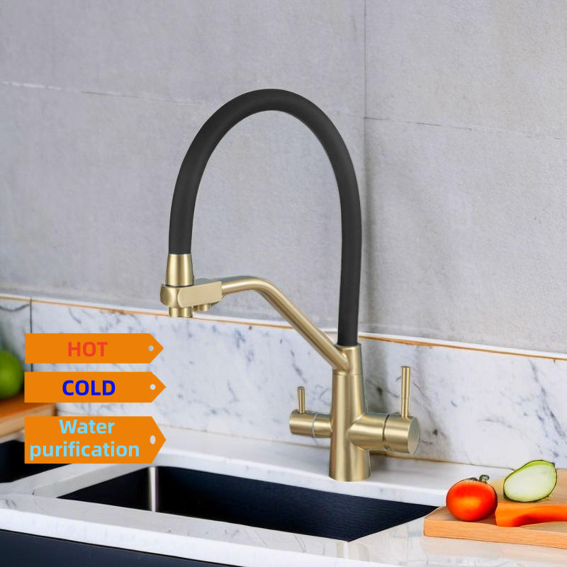 Robinet de cuisine en acier inoxydable 304 robinet de filtre à eau 3-en-1 tuyau en silicone flexible Rotation à 360 degrés 3 voies 2 sorties d'eau