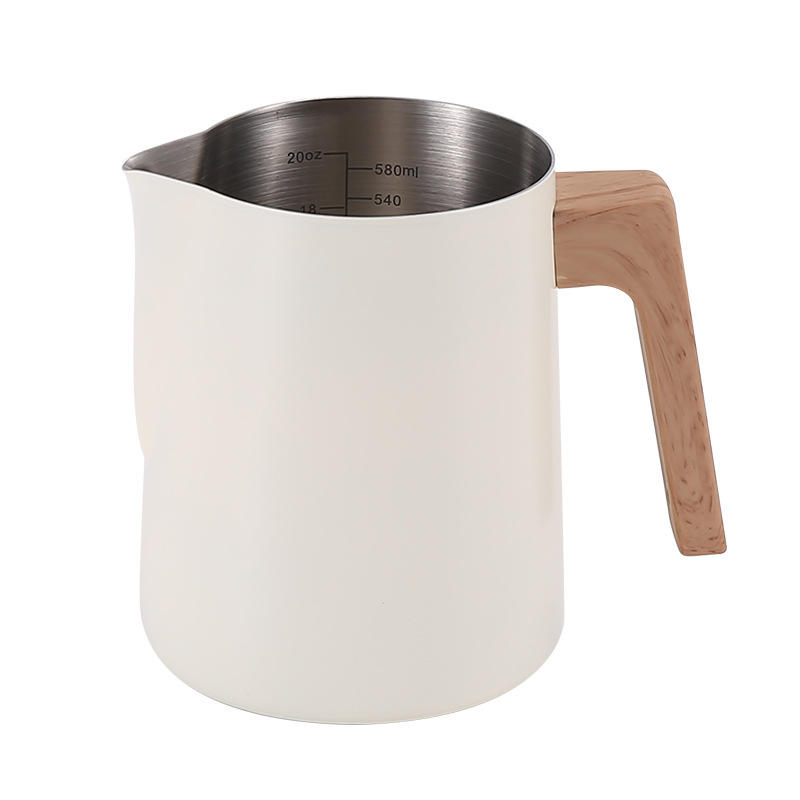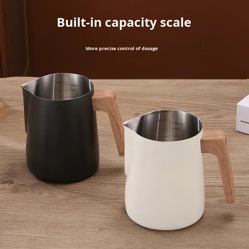 Pichet à mousse de lait en acier inoxydable 304 avec échelle de mesure, poignée en bois pour l'art du latte, le cappuccino, l'utilisation à domicile et au café