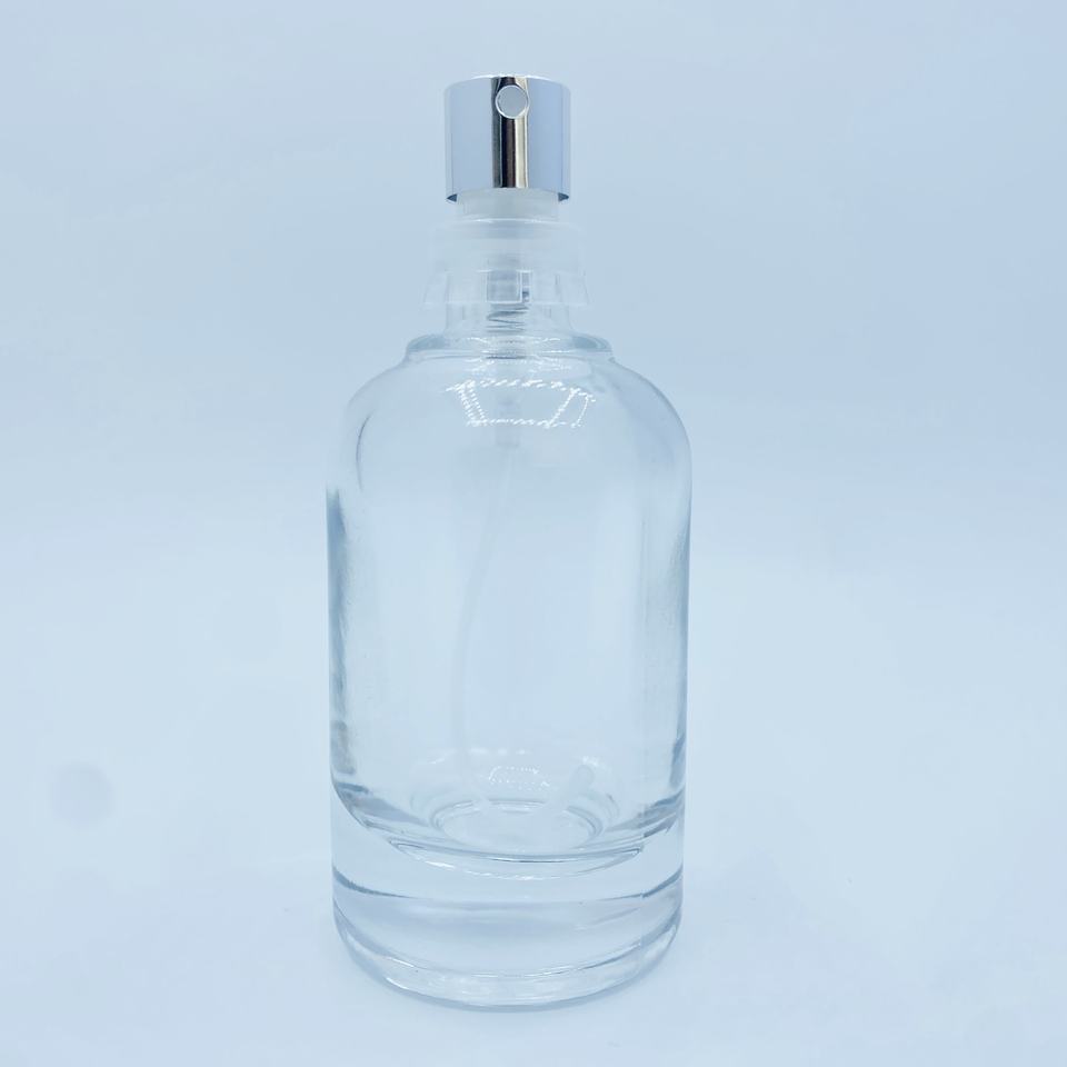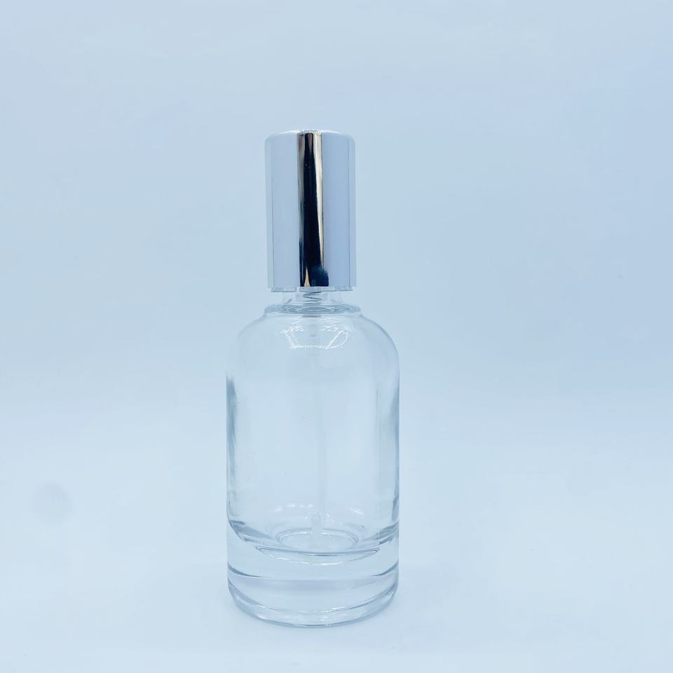 Bouteille distributeur de parfum cylindrique avancée transparente de 30ml avec bocaux en verre à capuchon argenté pour la distribution de parfums de soins personnels
