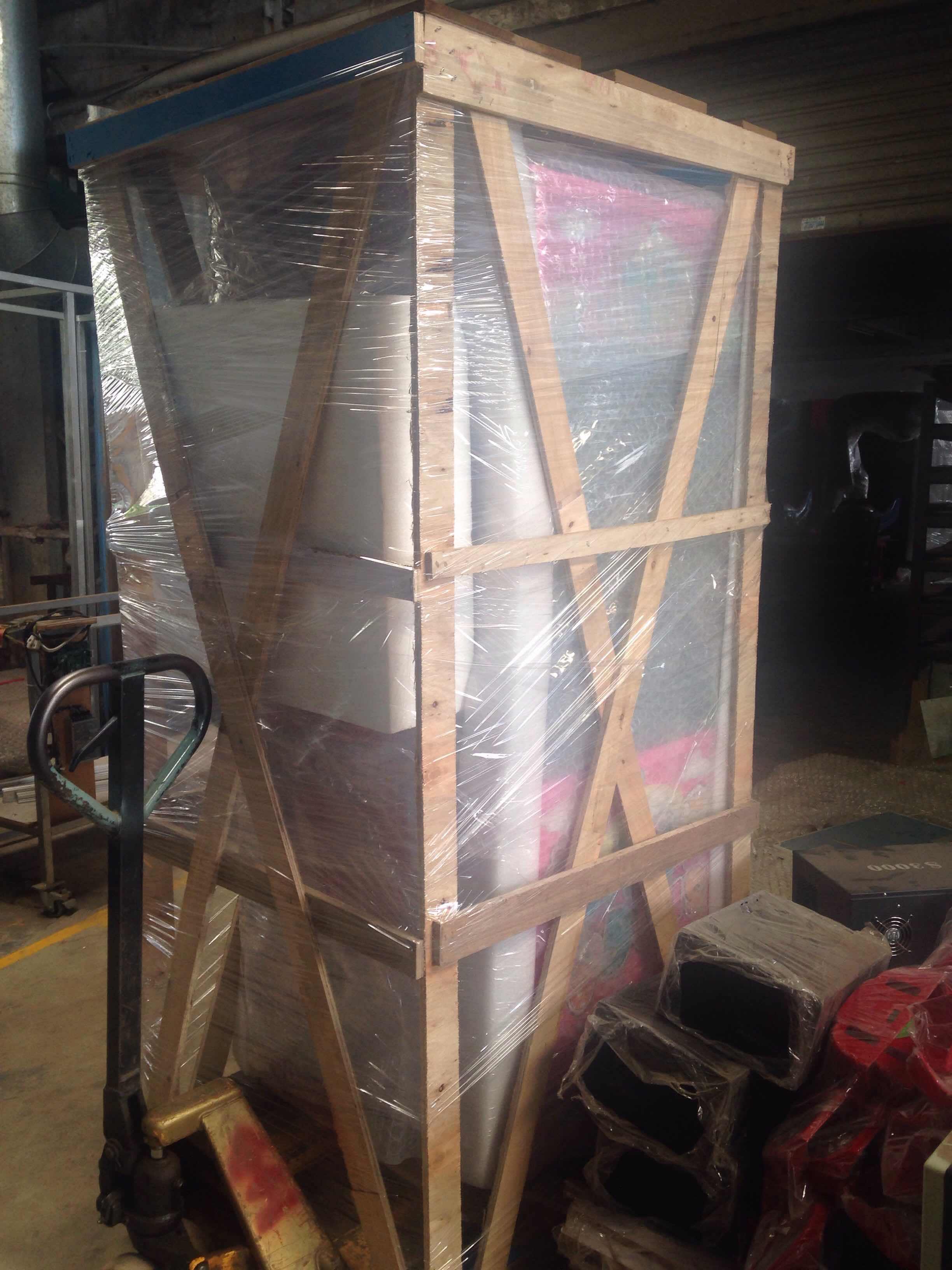 Package:Bubble pack + wellpappe + stretch films + wood frame