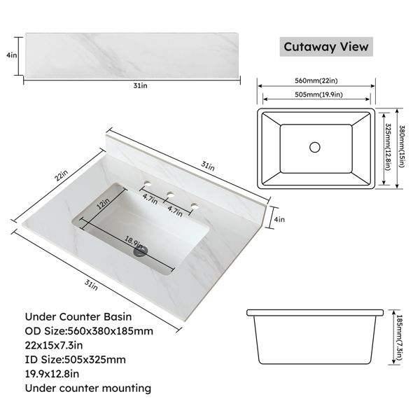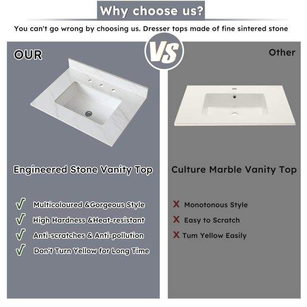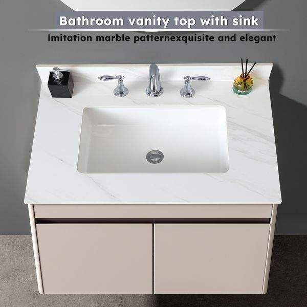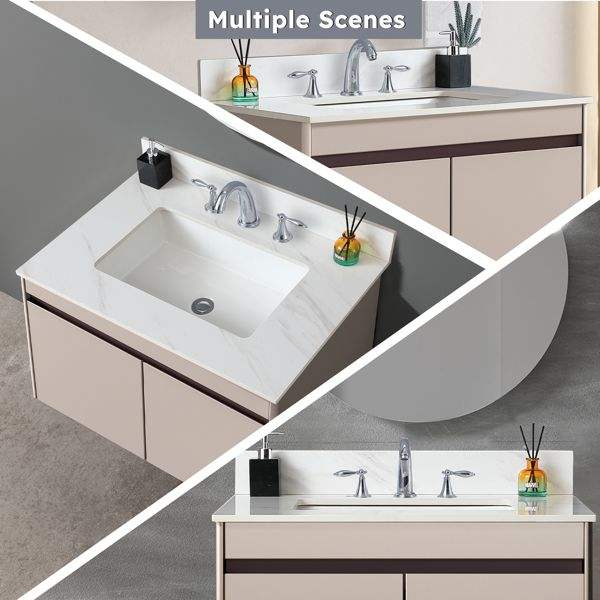 Plan de toilette rectangulaire en marbre blanc de 31 pouces avec trous de robinetterie pré-percés, à poser sous le meuble de salle de bain