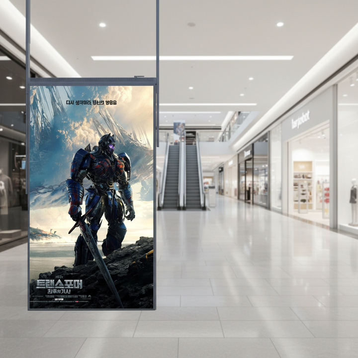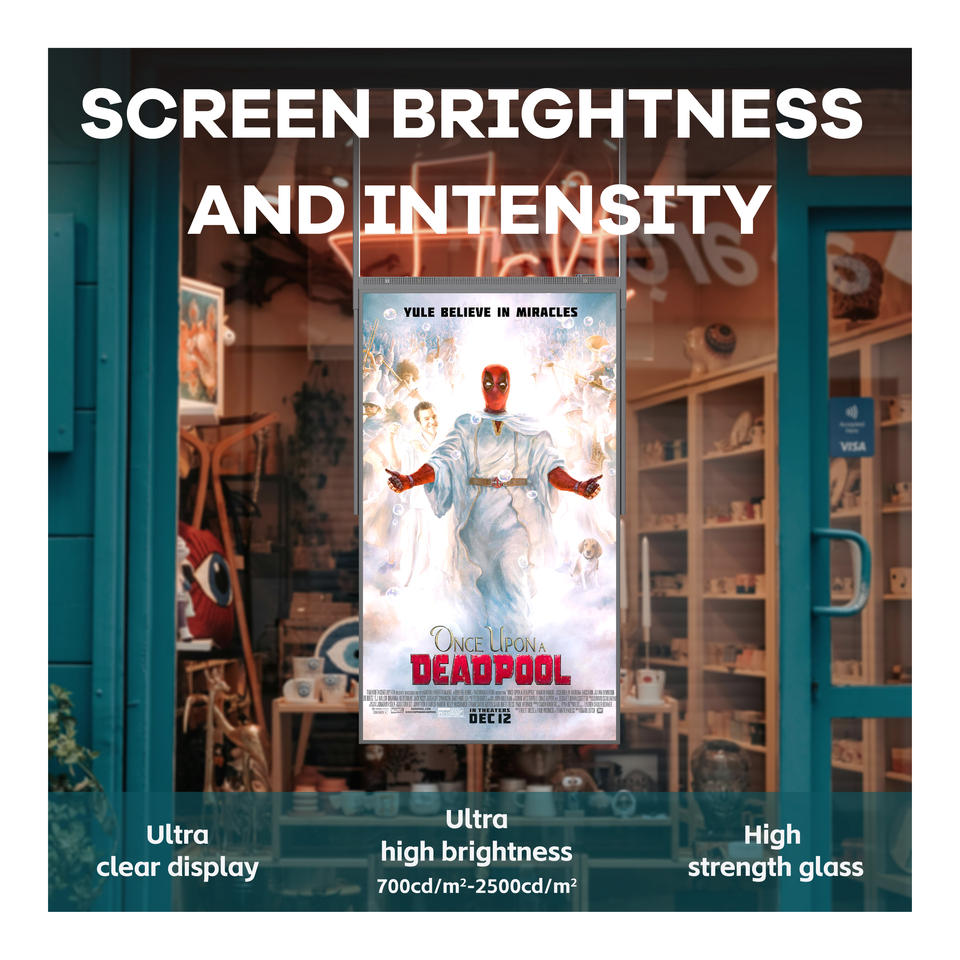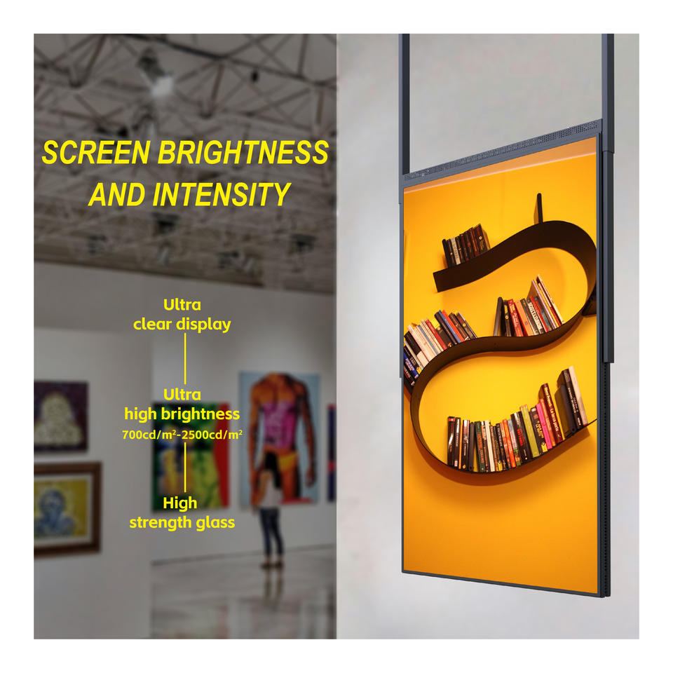 Écran publicitaire LCD double face UHD suspendu pour fenêtre, 32 43 55 65 pouces, luminosité 3000 nits, avec SDK, OEM, garantie 1 an