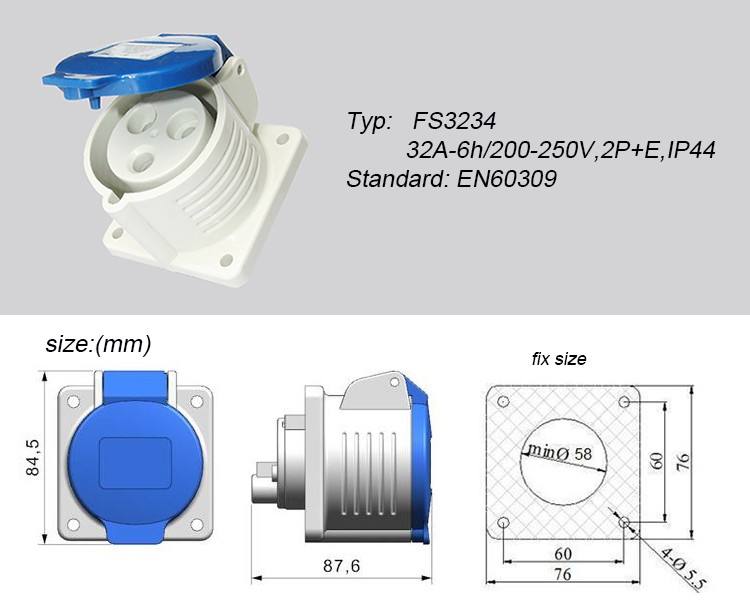 32A 2P + E 3PIN 220V IP44 femelle panneau prise monophasée étanche aux éclaboussures industrielle CEE prise de montage encastrée FS3234
