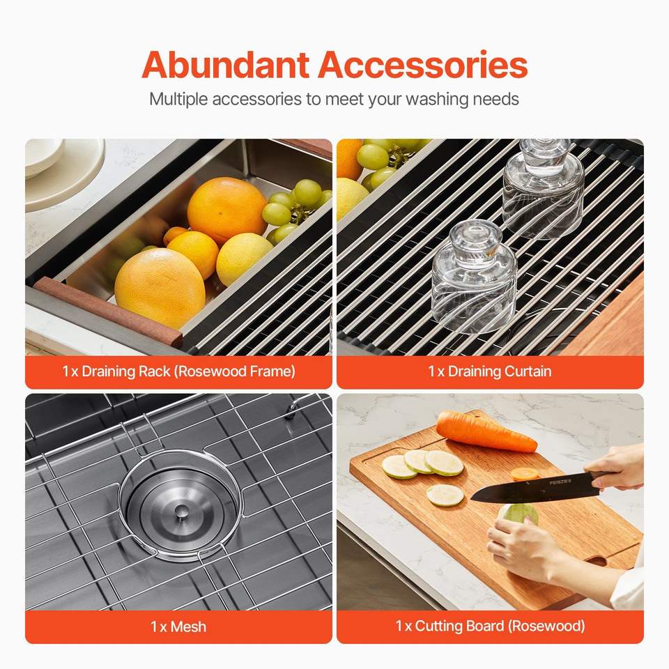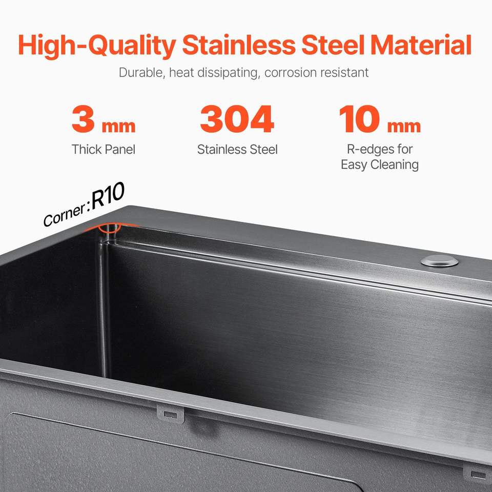Évier de cuisine 33 pouces en acier inoxydable 304, poste de travail à montage sur plan, cuve unique, style ferme avec rebord, design encastrable
