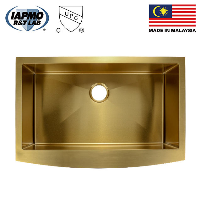Évier de cuisine rectangulaire simple à face unique de 33 pouces AS-R3321-G en or, design moderne, acier inoxydable, valve en nano-titane