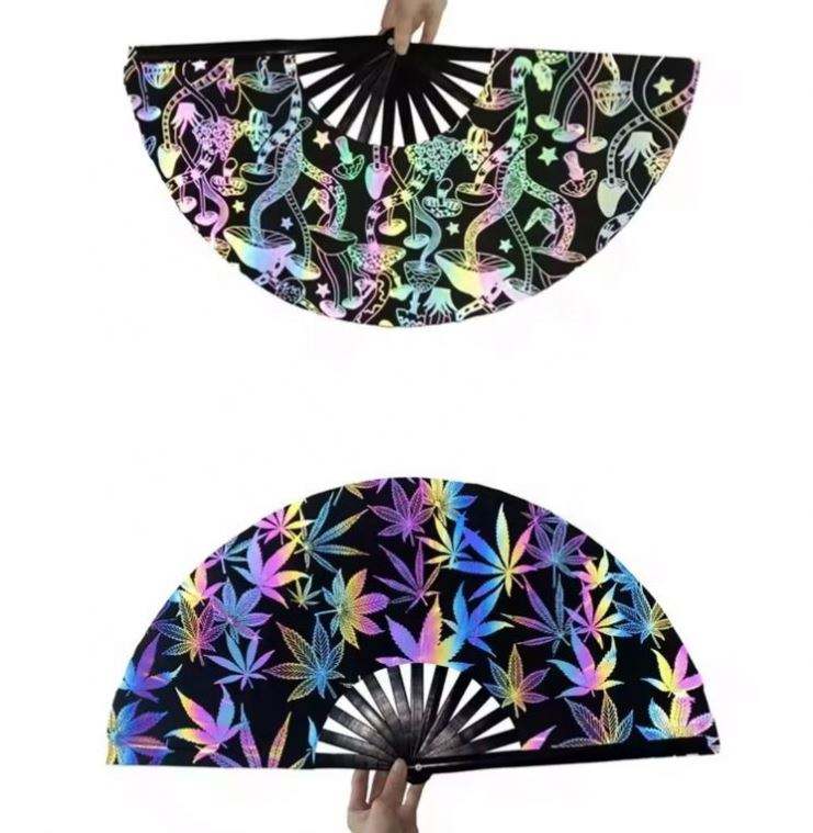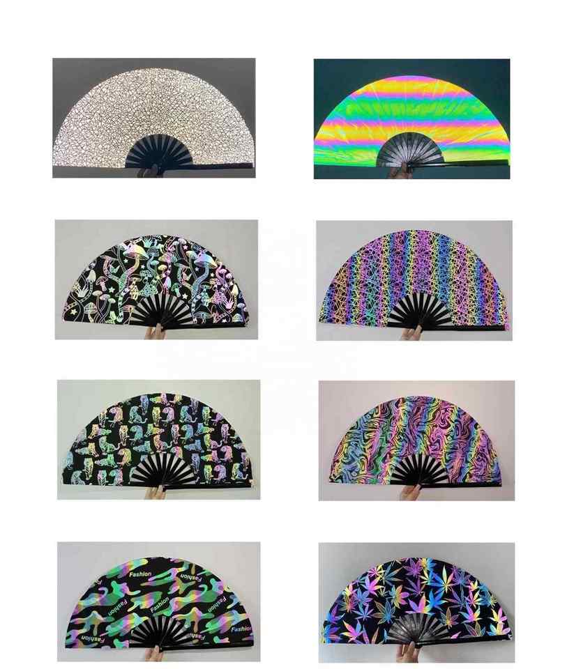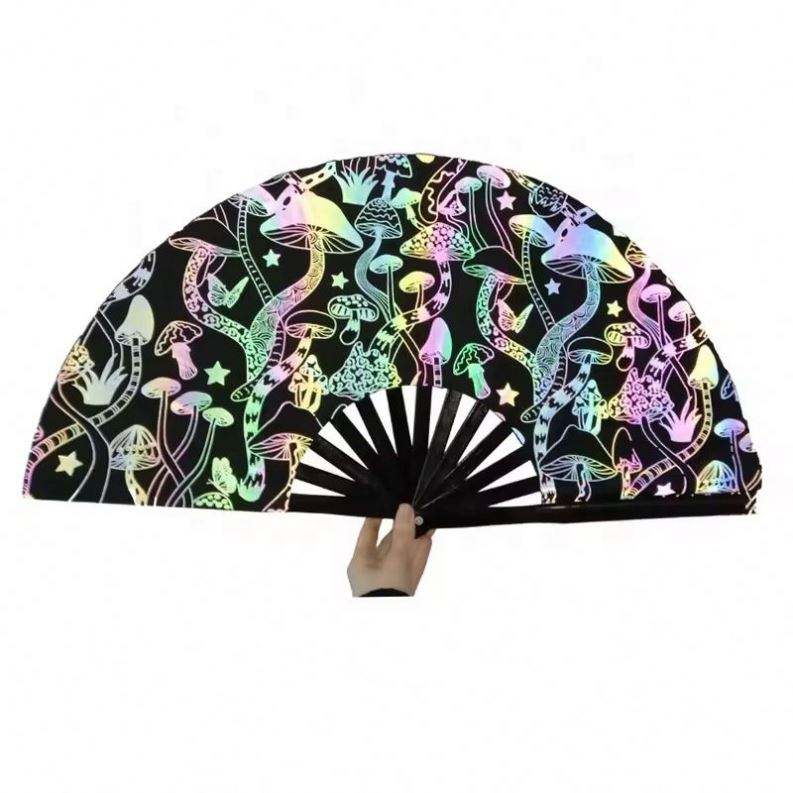 Éventail pliable promotionnel en bambou noir de 33 cm avec tissu réfléchissant de 13 pouces