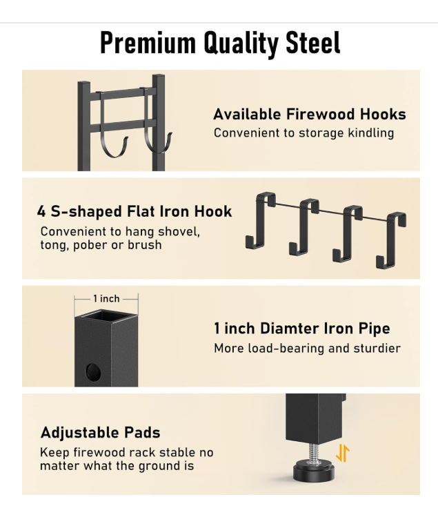 Support de bois de chauffage intérieur/extérieur robuste de 34 pouces avec crochets d'allumage Coussinets réglables Support de rangement en bois en métal pour terrasse de cheminée