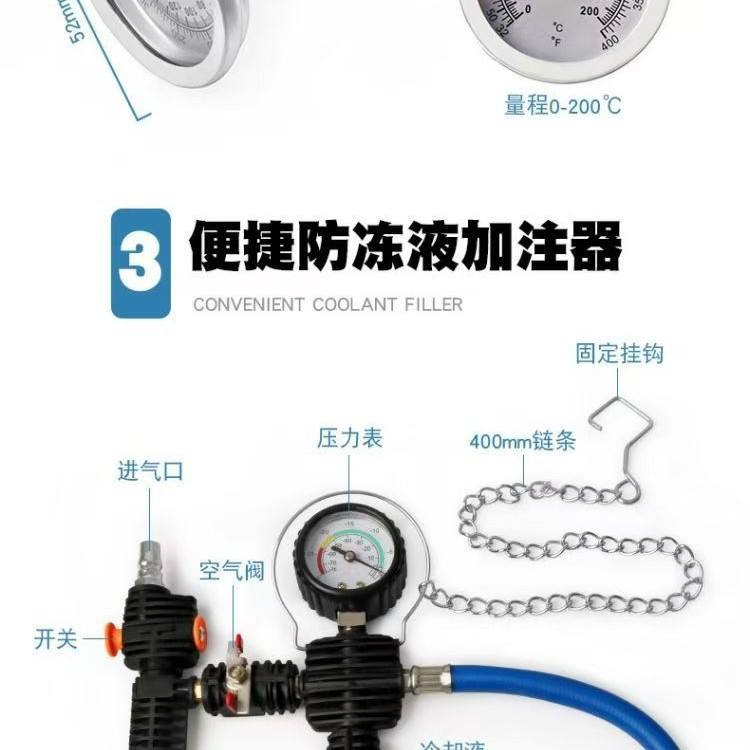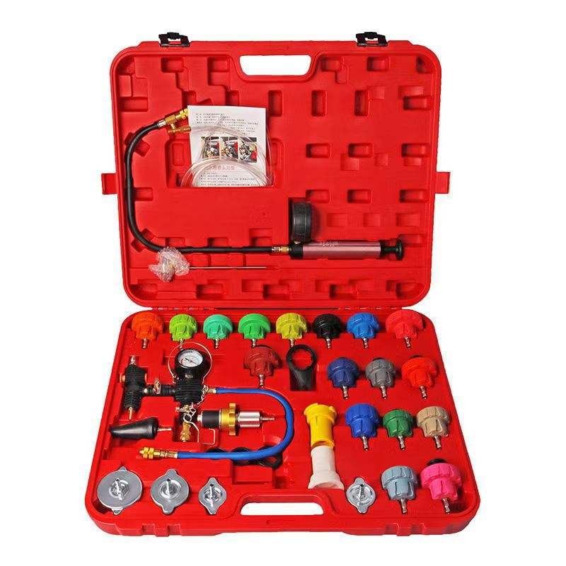Kit de détection de fuites de radiateur de voiture 34 pièces avec manomètre et pompe à air pour le test du système de refroidissement et le remplacement du liquide antigel