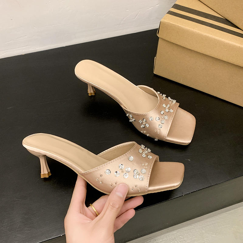 Nouvelles Sandales d'été élégantes à talon moyen et bout carré orné de strass pour femme, grandes tailles, tendance, à porter avec une jupe