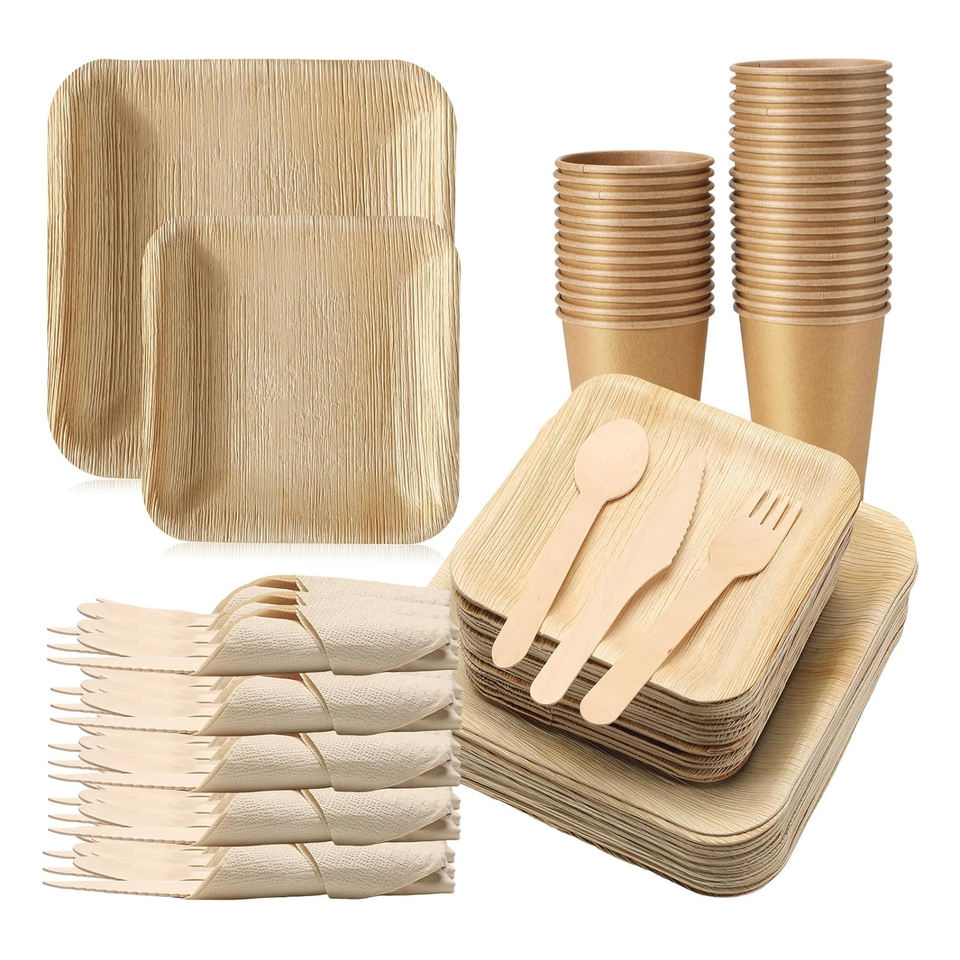 Ensemble de vaisselle jetable écologique en feuilles de palmier, quantité personnalisée, pour la rentrée scolaire, style moderne, 50 assiettes carrées, 50 assiettes à dessert