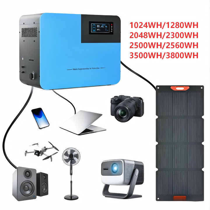 Station d'alimentation portable LiFePO4 3500Wh avec onduleur à onde sinusoïdale pure, panneau solaire, démarreur de batterie, compresseur d'air, MPPT et batterie externe pour voiture