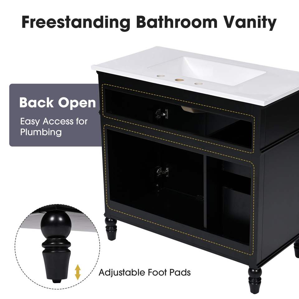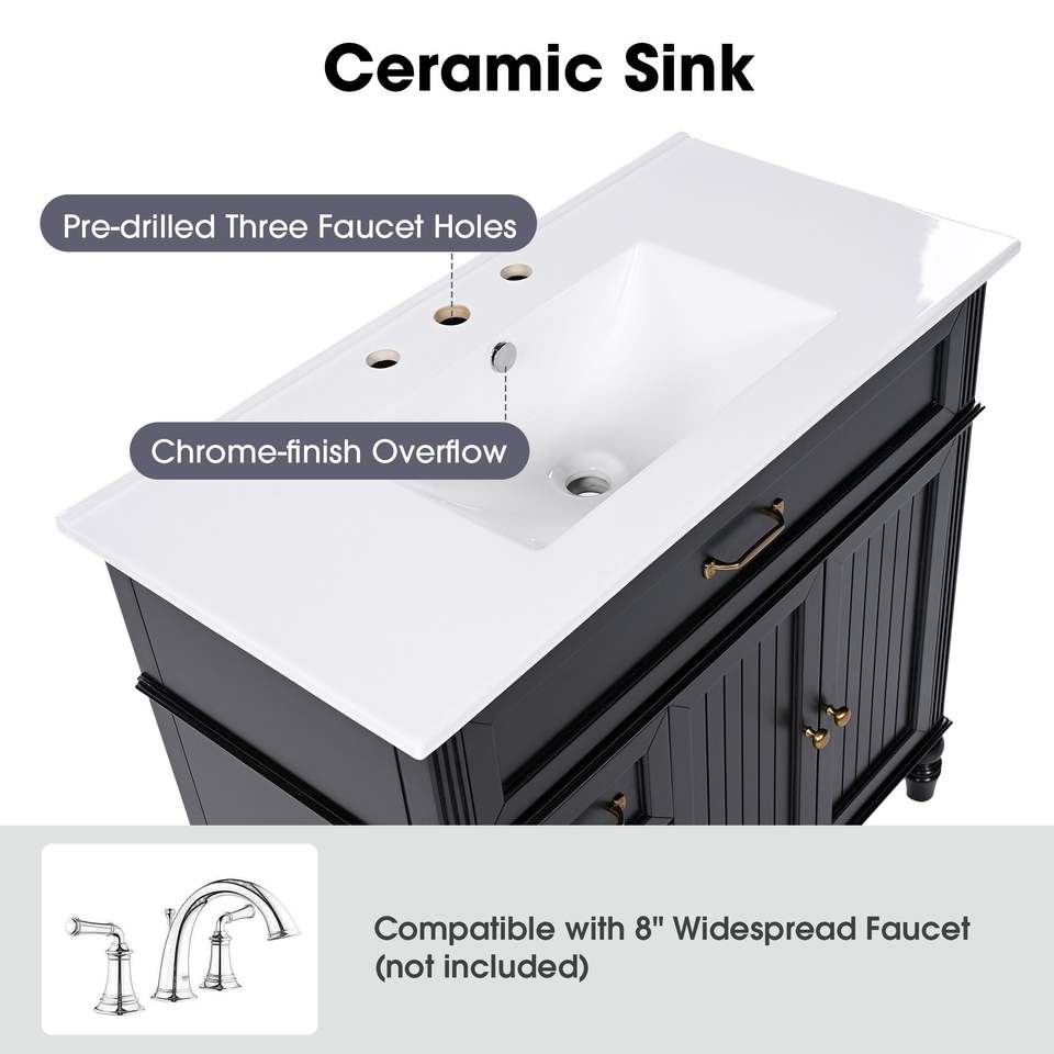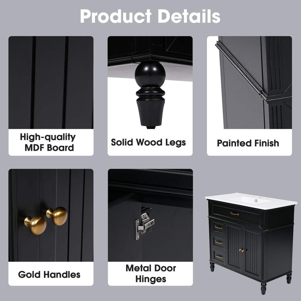 Meuble-lavabo de salle de bain noir de 36 pouces avec structure solide et panneau MDF, avec lavabo et tiroirs, livré en un seul colis