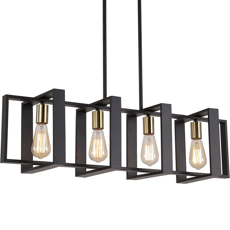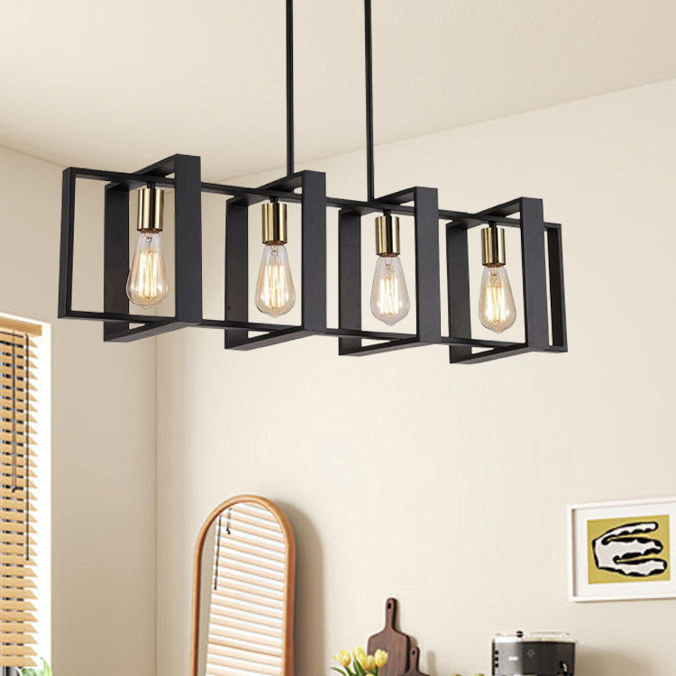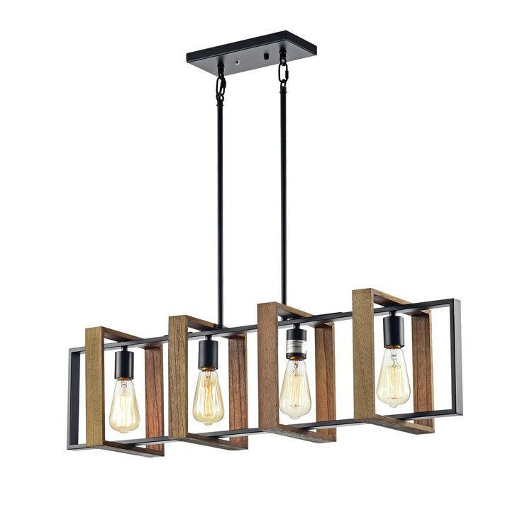 Luminaire suspendu rectangulaire en bois rustique et métal noir de 36 pouces, 4 lumières, design de ferme pour îlot de cuisine, lustre industriel