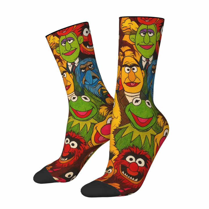 Chaussettes d'équipage tricotées imprimées numériques 360-Big Frog Puppet He Street of Cinnamon Pattern-Chaussettes de sport à la mode et uniques