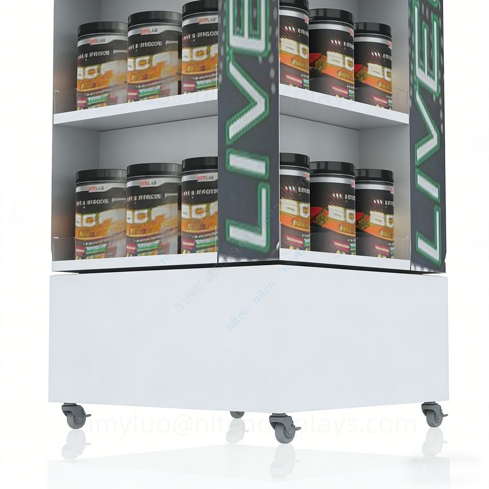 Étagère de présentation rotative à 360 degrés en métal avec roulettes, présentoir de supermarché à 4 faces pour l'organisation des confitures, des épices et des condiments