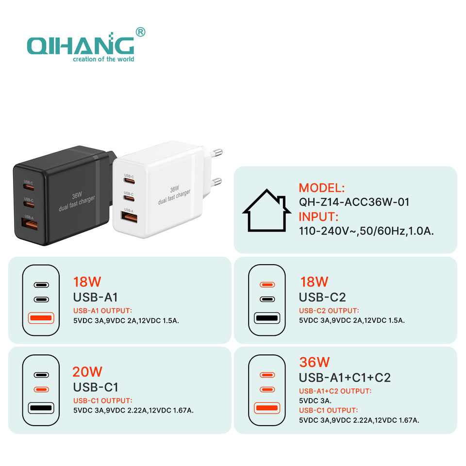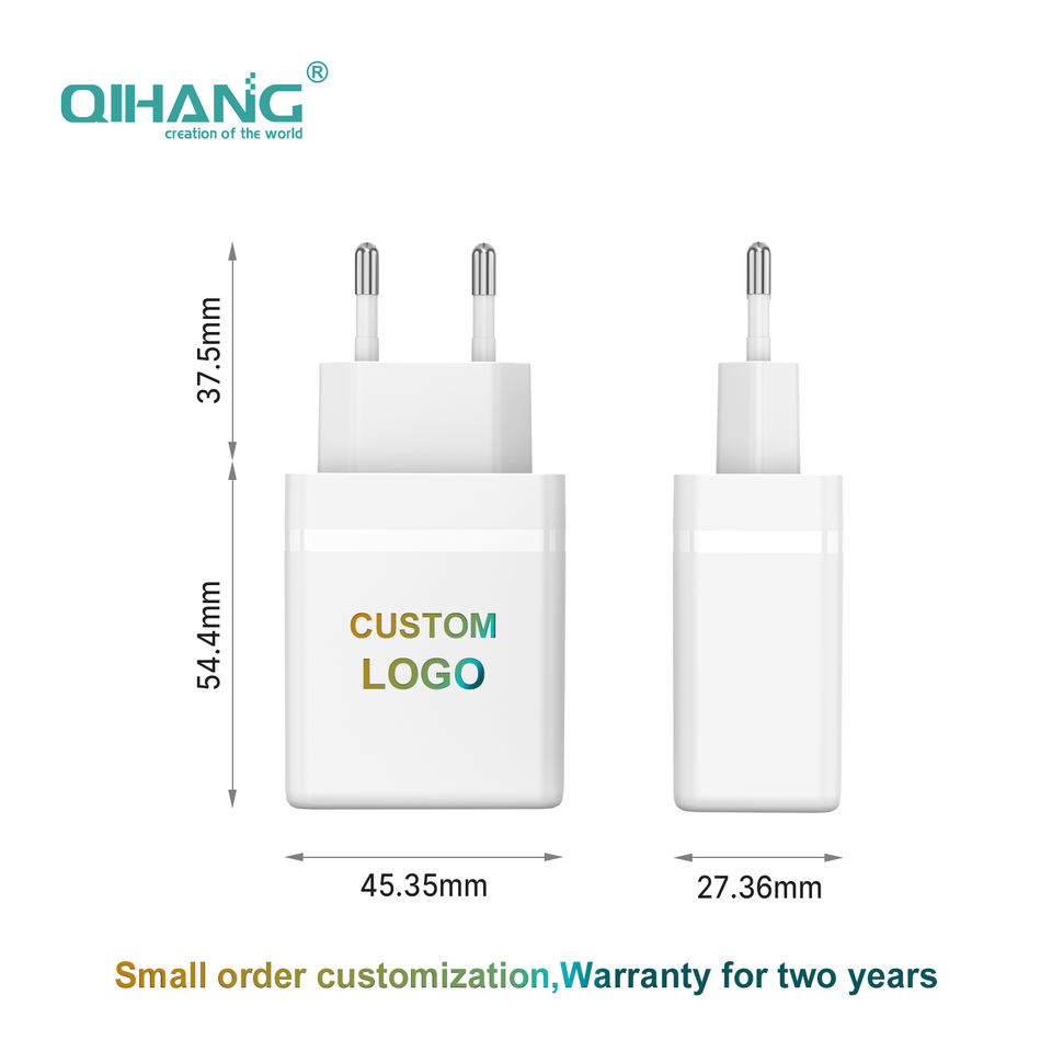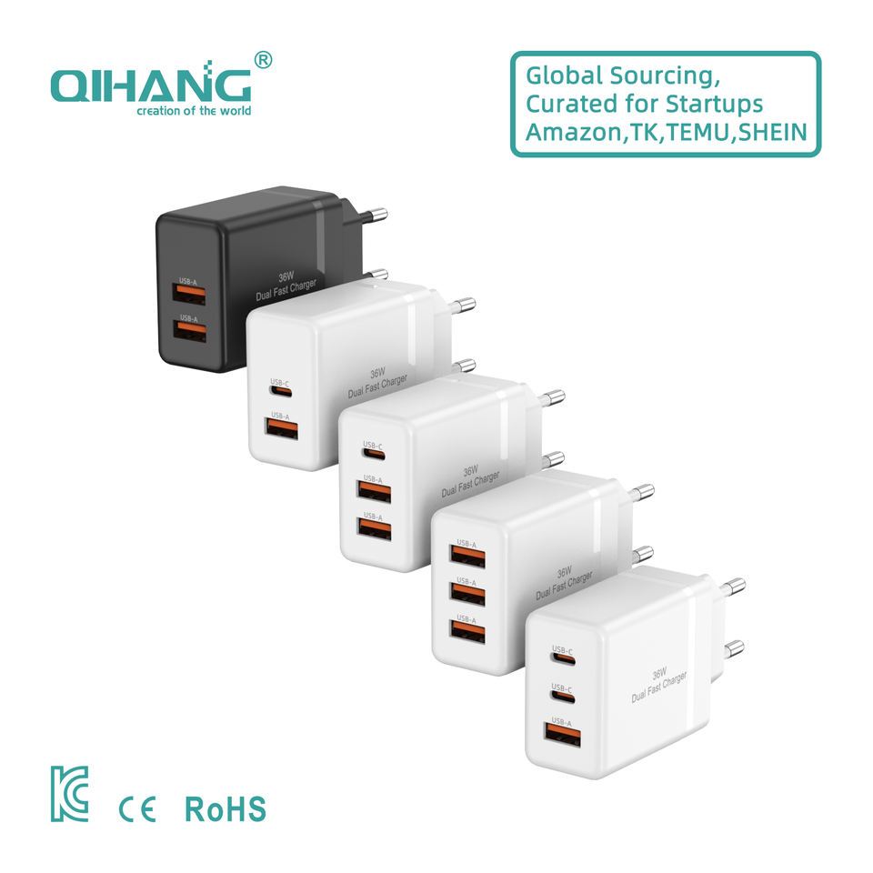 Chargeur rapide double port 36W avec double transformateur, certifié CB CE RoHS, charge rapide PD, chargeur mural avec prise EU