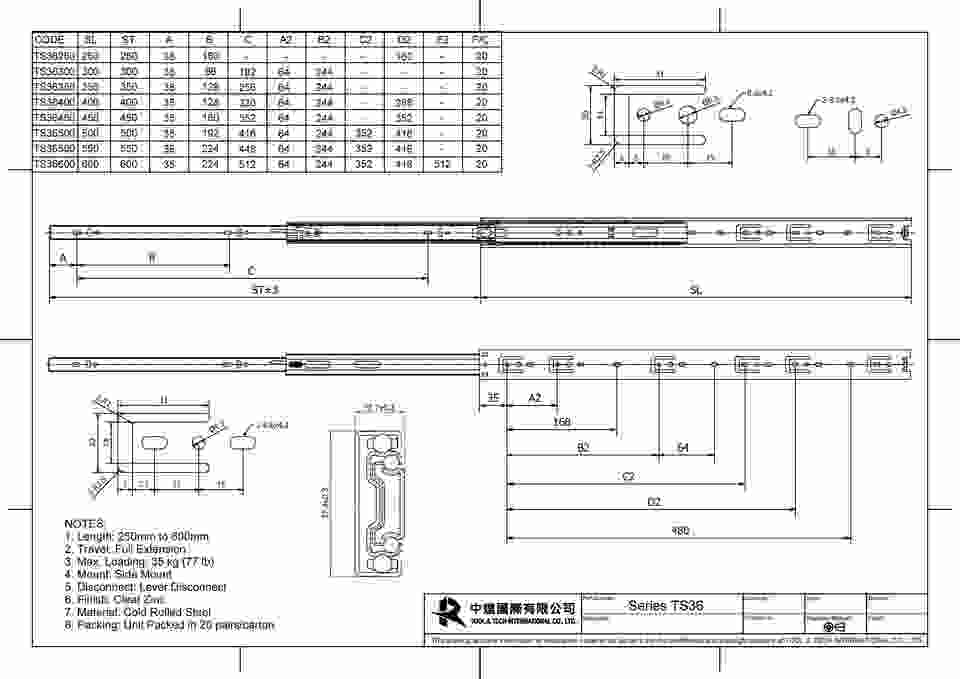 Tiroir de cuisine à roulement à billes en acier à trois sections de 36mm avec dégagement rapide et capacité de charge de 35kg