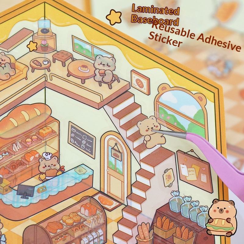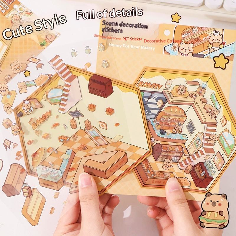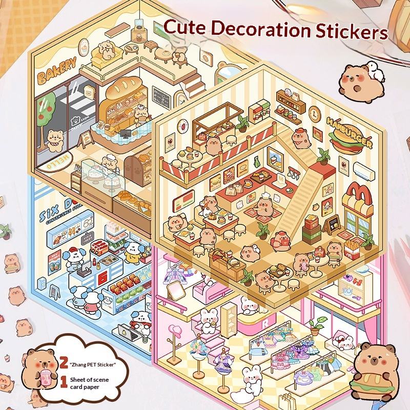 Autocollants en PET 3D de paysage de cabane de dessin animé, réutilisables, pour la création de scènes miniatures DIY, pour journaux, albums de scrapbooking, articles de papeterie anti-stress