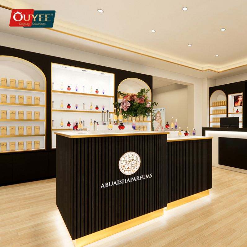 Présentoir de collection de parfums personnalisé 3D Idées Présentoir de parfums design vitrine de parfumerie de luxe Étagères avec lumière LED