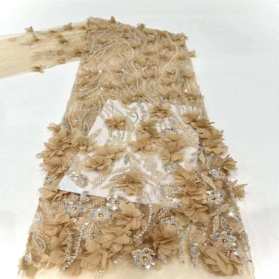 Tissu en dentelle africaine en polyester avec broderie de perles, nouveau design, dentelle en tulle à fleurs 3D avec perles pour femmes