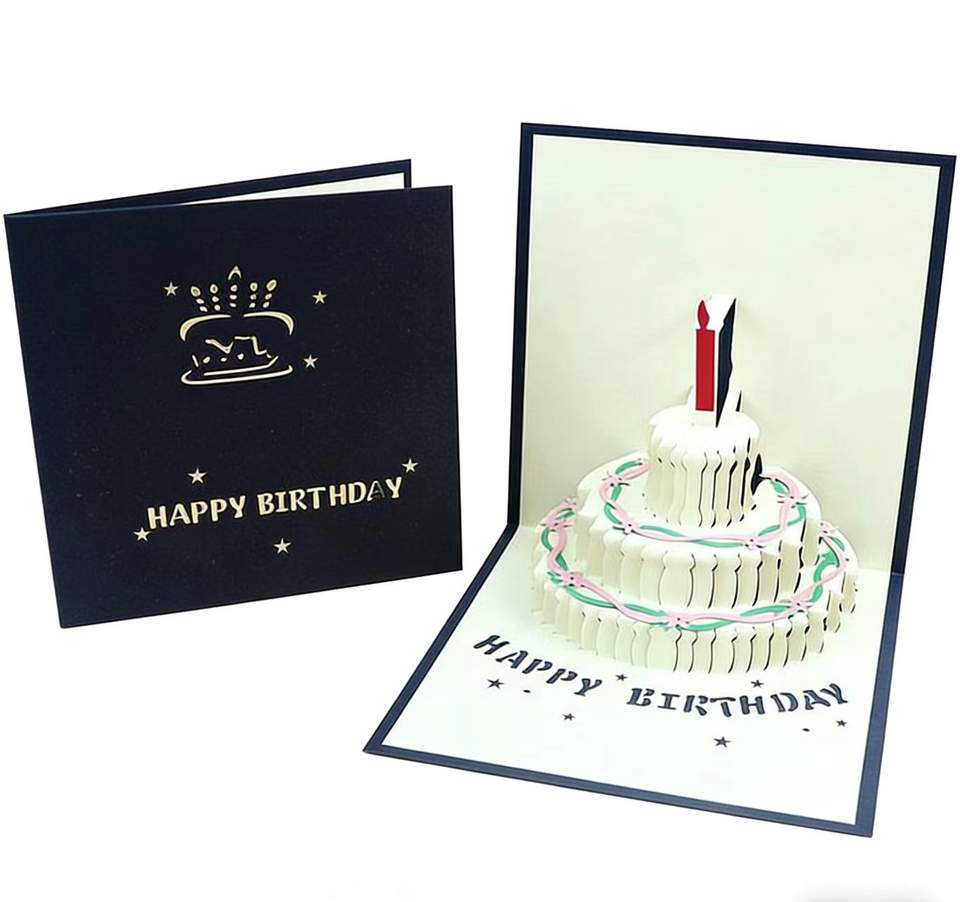 Carte de vœux pliante 3D personnalisée avec motif de gâteau, papillon, invitation d'anniversaire, carte de célébration, impression numérique blanche