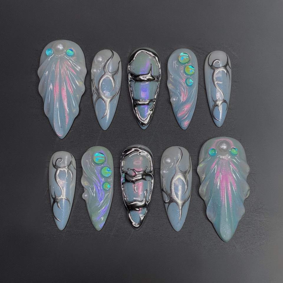 Lot de 10 Faux Ongles Press-On 3D de Haute Qualité, Style Océanique Estival, Amande Stiletto de Luxe, Faits Main, Fournisseur en Gros