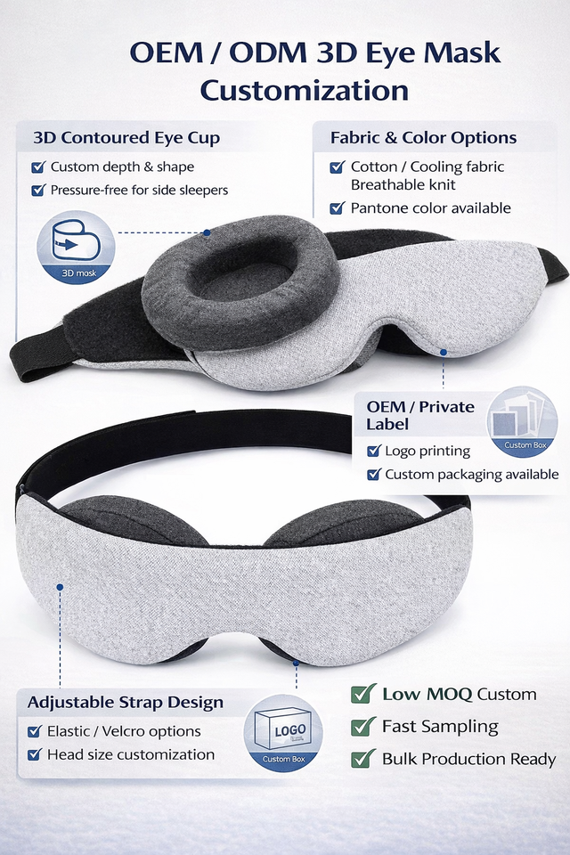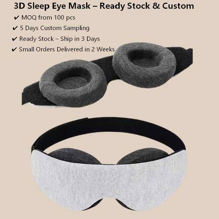 Masque de sommeil 3D en mousse à mémoire de forme, occultation totale, faible MOQ (100 pièces), échantillonnage personnalisé en 5 jours, stock disponible pour livraison rapide