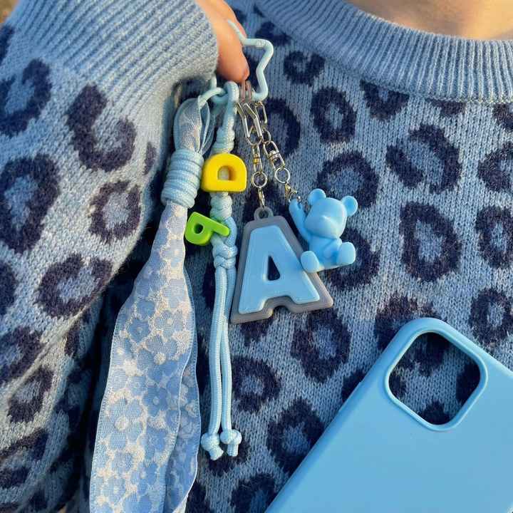 Porte-clés Ours Alphabet Bleu Imprimé en 3D avec Ruban Floral et Fermoir Étoile, Breloque de Sac en PLA, Accessoire Y2K Balletcore Doux et Cool, Cadeau Personnalisé