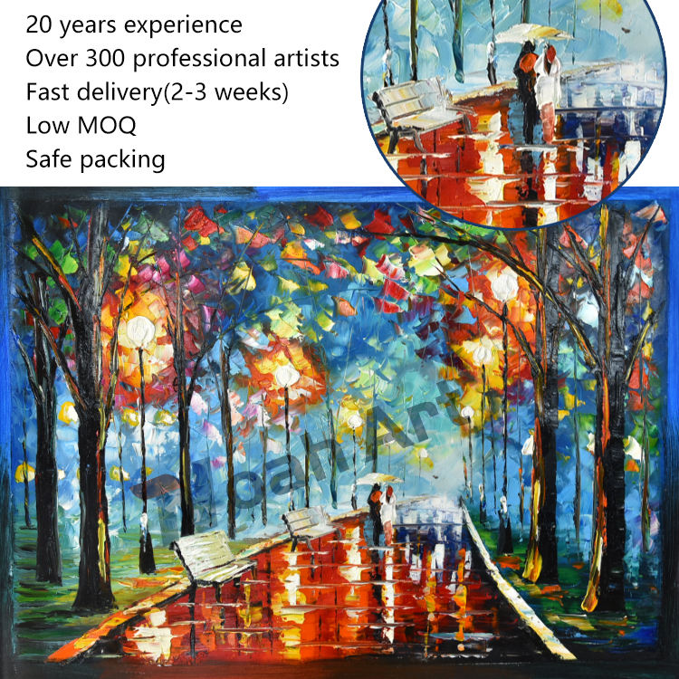 Peintures à l'huile sur toile abstraites d'arbres d'automne avec palette texturée 3D, art mural, paysage de rue nocturne sous la pluie