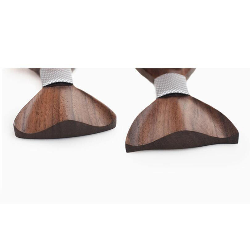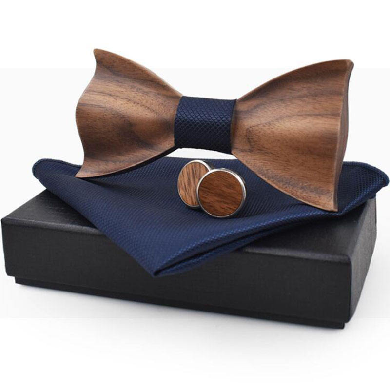 Nœud papillon en bois 3D pour hommes, mouchoir motif rayé avec boutons de manchette, boîte cadeau