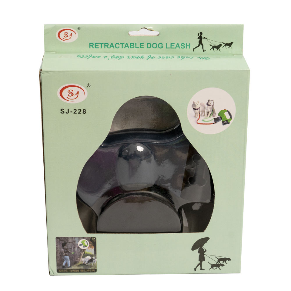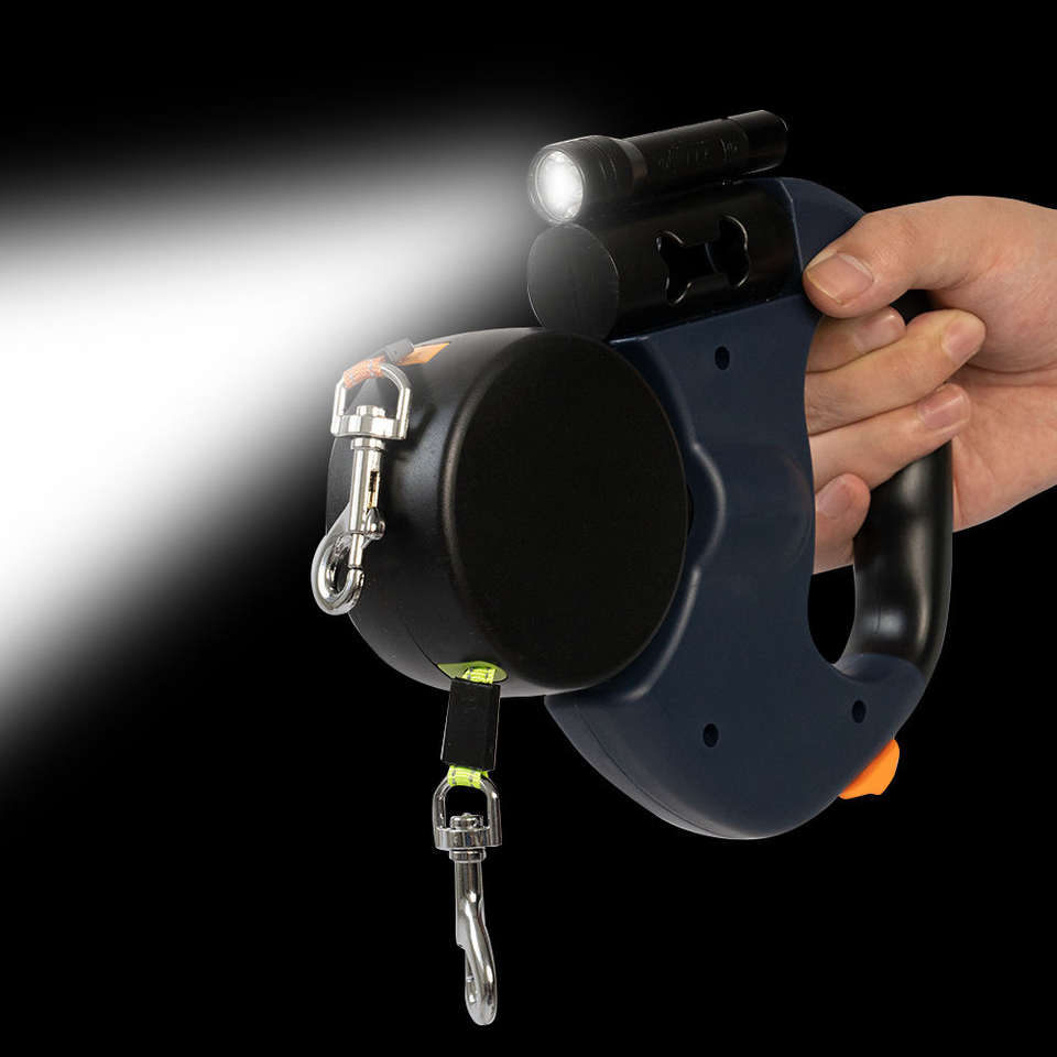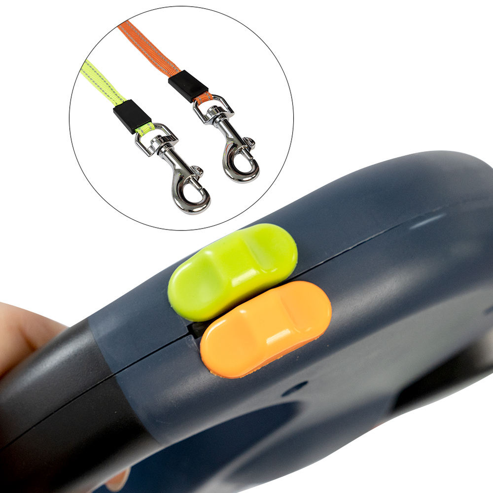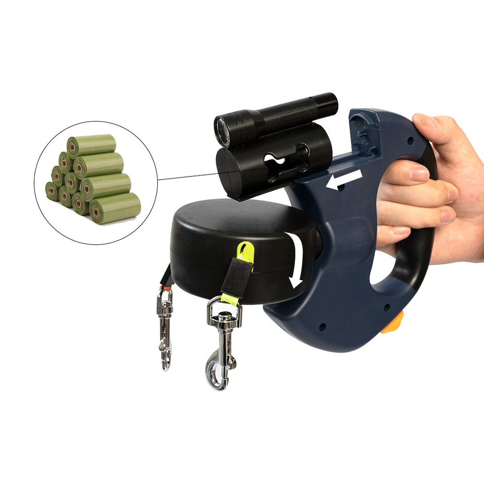 Laisse rétractable de luxe 3M pour chiens, en nylon, plastique et acier inoxydable, avec éclairage LED, motif uni, et distributeur de sacs à déjections pour deux chiens
