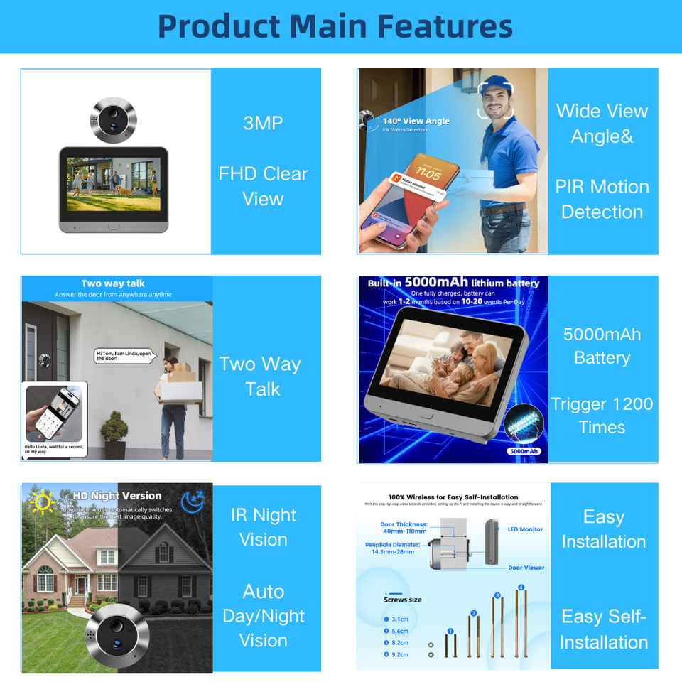 3MP Wifi Mini caméra vidéo espion cachée 5000mAh Audio bidirectionnel Angle de vue 140 ° PIR Détection de mouvement Judas Sonnette