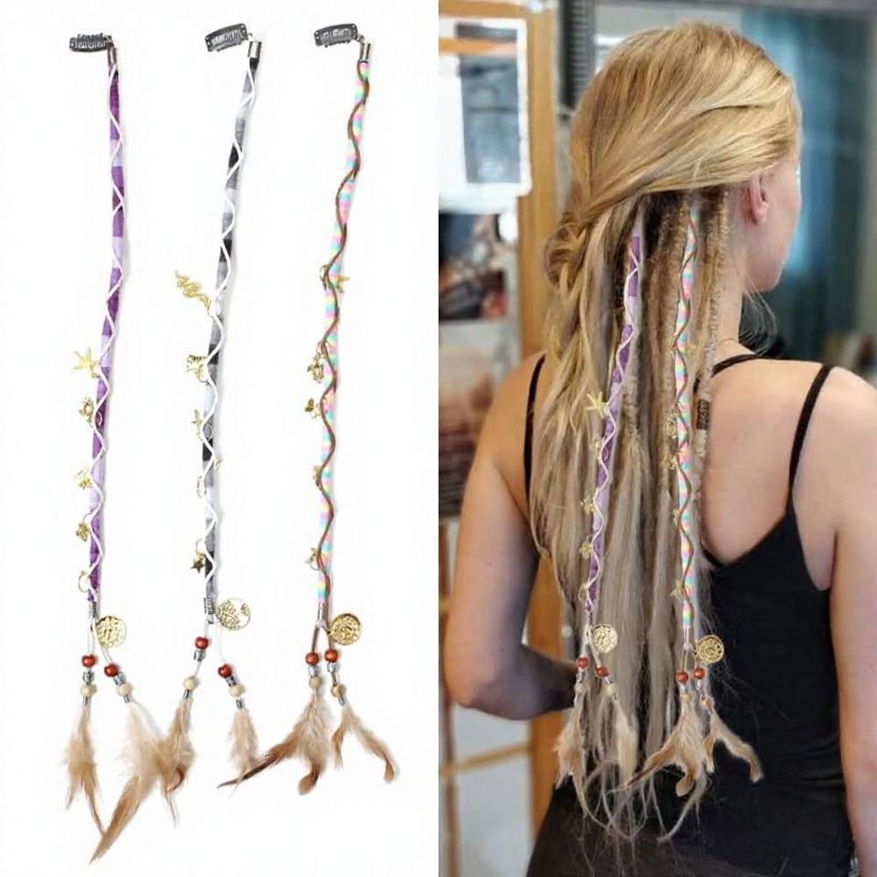 3 Pièces Extensions de Dreadlocks à Clipser, Accessoires Capillaires Bohème Hippie, Pendentifs Plumes et Perles, Enrouleurs de Dreadlocks Faits Main, Tresses Colorées et Boucles