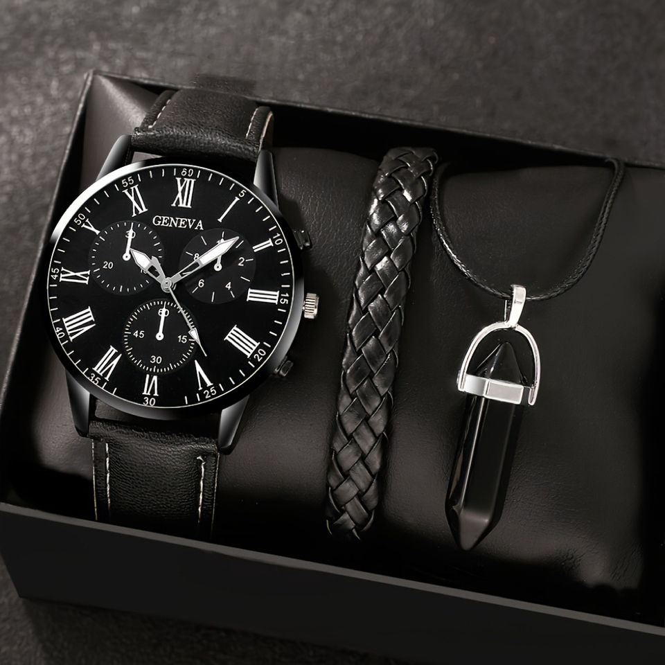 Ensemble de 3 montres à quartz pour homme avec bracelet chaîne, montres de luxe pour homme, cadeau pour homme